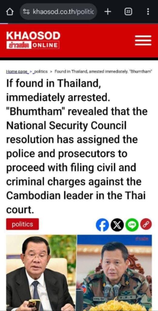 PTH÷ប្រសាសន៍ដ៏មានអត្តន័យសម្តេចតេជោ ហ៊ុន សែន នៅយប់ថ្ងៃទី១៨ សីហា ឆ្នាំ២០២៥ បានបង្ហោះលើផេកផ្លូវការណ៍របស់សម្តេចថា (តាមកាសែតថៃចុះផ្សាយមុននេះបន្តិចថា លោកនាយករដ្ឋមន្ត្រីស្តីទីថៃបាននិយាយថា លោក ហ៊ុន សែន និង ហ៊ុន ម៉ាណែត និងត្រូវចាប់ខ្លួនភ្លាមប្រសិនបើរកឃើញក្នុងប្រទេសថៃ។ប្រសិនបើការចុះផ្សាយរបស់កាសែតជាសំដីពិតរបស់នាយករដ្ឋមន្ត្រីស្តីទីជិតផុតអាណត្តិបង្ហាញឲ្យឃើញថា គាត់គឺជាមនុស្សព្រៃមិនស្គាល់អ្វីទៅជាច្បាប់ទម្លាប់ហើយមិនទាំងចេះការទូតទៀតផង។ប្រសិនបើថៃអាចចាប់មេដឹកនាំកម្ពុជាបាន កម្ពុជាក៏អាចចាប់មេដឹកនាំថៃមួយចំនួនដែលបានឈ្លានពាន និងសម្លាប់ប្រជាជនកម្ពុជាបានដូចគ្នាដែរ។ច្បាប់ទម្លាប់ត្រូវបានបំផ្លាញដោយពួកឈ្លានពាន។ តើនេះជាគោលបំណងដើម្បីបង្កើតជំនឿទុកចិត្ត និងឈានទៅរកទំនាក់ទំនងល្អឬបំផ្លាញដើម្បីបង្កើតជម្លោះឡើងវិញក្រោយកិច្ចព្រមព្រៀងឈប់បាញ់?)According to a recent report by a Thai newspaper, the acting Prime Minister of Thailand stated that Hun Sen and Hun Manet would be immediately arrested if found in Thailand.If the newspaper’s publication accurately reflects the acting Prime Minister’s remarks, who is nearing the end of his term, it reveals that he is a reckless individual who lacks understanding of customary law and diplomatic protocol.If Thailand is in a position to arrest Cambodian leaders, then Cambodia could likewise arrest certain Thai leaders who have invaded and killed Cambodian citizens.Customary law has been violated by the aggressors.Is this an effort to build trust and move toward better relations, or an act of provocation that could reignite conflict following the ceasefire agreement?