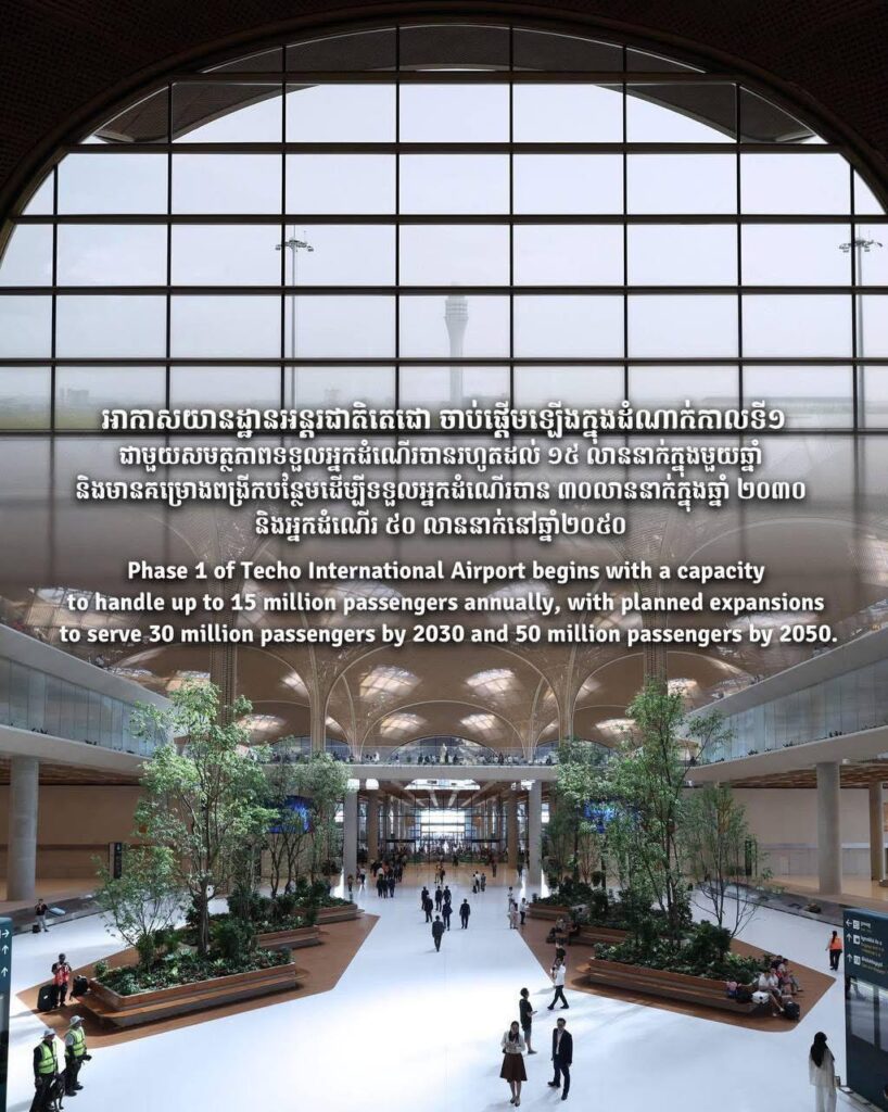 PTH÷ក្រោមកាលដឹកនាំដ៏ឆ្លាតវ៉ៃរបស់សម្តេចតេជោធបតី ទាំងនេះជាសមិទ្ធផលថ្មីស្រឡាងសម្រាប់កម្ពុជាឆ្ពោះទៅរកកាលអភិវឌ្ឃន៍ឲ្យកាន់តែខ្លាំង ជាក់ស្តែង(អាកាសយានដ្ឋានអន្តរជាតិតេជោ ចាប់ផ្តើមឡើងក្នុងដំណាក់កាលទី១ ជាមួយសមត្ថភាពទទួលអ្នកដំណើរបានរហូតដល់ ១៥លាននាក់ក្នុងមួយឆ្នាំ និងមានគម្រោងពង្រីកបន្ថែមដើម្បីទទួលអ្នកដំណើរបាន ៣០លាននាក់ក្នុងឆ្នាំ២០៣០ និងអ្នកដំណើរ ៥០លាននាក់នៅឆ្នាំ២០៥០Techo International Airport began construction with an initial phase designed to handle up to 15 million passengers per year, with plans to expand capacity to 30 million passengers by 2030 and 50 million by 2050)។ប្រភពផេកផ្លូវរបស់ក្រសួងព័ត៌មាន