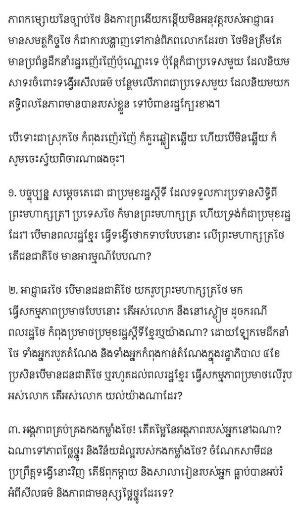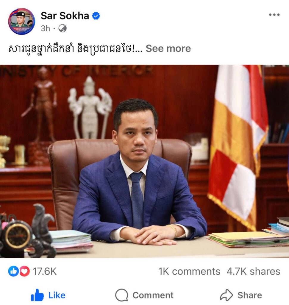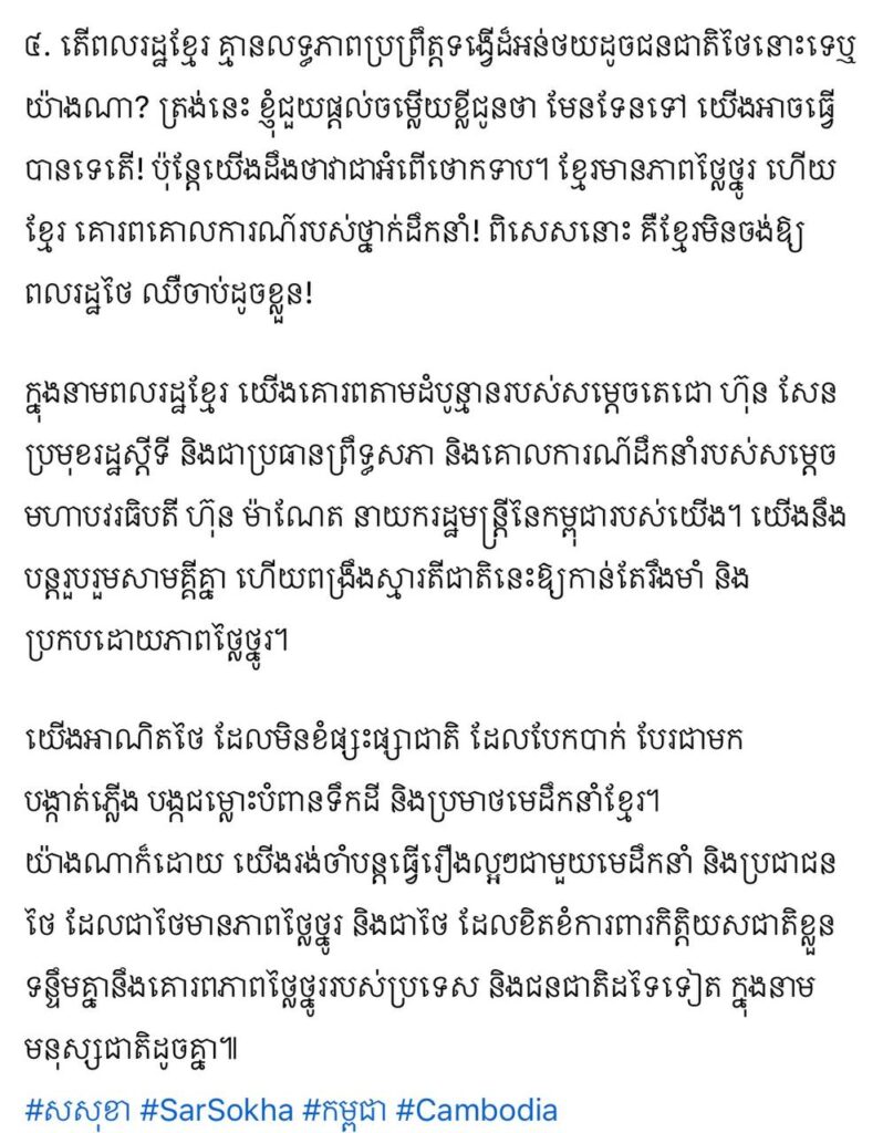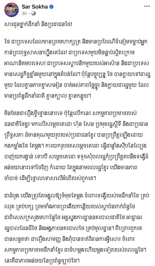 PTH÷ តាមរយៈផេកហ្វេសប៊ុកផ្លូវការ នាល្ងាចថ្ងៃទី៩ ខែតុលា ឆ្នាំ២០២៥ ឯកឧត្តមអភិសន្តិបណ្ឌិត ស សុខា ឧបនាយករដ្ឋមន្ត្រី រដ្ឋមន្ត្រីក្រសួងមហាផ្ទៃ បានផ្ញើសារ ៤ចំណុច ទៅកាន់ថ្នាក់ដឹកនាំ និងប្រជាជនថៃ បន្ទាប់ពីប្រជាជន និងកងកម្លាំងថៃមួយចំនួន បានយករូបថតសម្តេចតេជោ ហ៊ុន សែន ទៅធ្វើជាផ្ទាំងស៊ីប នៃល្បែងបាញ់យករង្វាន់ កាលពីពេលថ្មីៗនេះ។ក្នុងសារ ឯកឧត្តមអភិសន្តិបណ្ឌិត បានគូសបញ្ជាក់ថា ថៃ ជាប្រទេសដែលមានព្រះមហាក្សត្រ និងមានប្រពៃណីទំនៀមទម្លាប់អ្នកកាន់ព្រះពុទ្ធសាសនាហ្នឹងគេដែរ! ជាប្រទេសមួយមិនធ្លាប់ស្ថិតក្រោមអាណានិគមបរទេស! ជាប្រទេសស្ថាបនិកមួយរបស់អាស៊ាន និងជាប្រទេសមានសេដ្ឋកិច្ចខ្លាំងមួយនៅក្នុងតំបន់ដែរ។ ប៉ុន្តែបច្ចុប្បន្ន ថៃ បានក្លាយទៅជារដ្ឋមួយ ដែលគ្មានភាពខ្មាសអៀន បាត់អស់ភាពថ្លៃថ្នូរ និងក្លាយជារដ្ឋមួយ ដែលមានប្រព័ន្ធដឹកនាំជាតិ គ្មានក្បាល គ្មានកន្ទុយ។ ឯកឧត្តមអភិសន្តិបណ្ឌិត ស សុខា បានបន្តទៀតថា មិនមែនជារឿងថ្មីថ្មោងនោះទេ ប៉ុន្តែលើកនេះ សកម្មភាពប្រមាថរបស់ជនជាតិថៃខ្លះ មកលើសម្ដេចតេជោ ហ៊ុន សែន ប្រមុខរដ្ឋស្ដីទី និងជាប្រធានព្រឹទ្ធសភា ដ៏មានគុណមួយរូបរបស់ប្រជាជនខ្មែរ បានប្រព្រឹត្តឡើងដោយកងកម្លាំងថៃ តែម្ដង។ ការយករូបថតសម្ដេចតេជោ ធ្វើជាផ្ទាំងស៊ីបនៃល្បែងបាញ់យករង្វាន់ ទោះបី សម្ដេចតេជោ ទទូចសុំពលរដ្ឋកុំប្រព្រឹត្តតបនឹងទង្វើដ៏អន់ថយនោះទៅថៃវិញ ក៏ដោយ តែក្នុងនាមពលរដ្ឋខ្មែរ យើងមានភាពចាំបាច់ ដើម្បីថ្កោលទោសលើអំពើរបស់ពួកគេ។ ក្នុងសំណេរដដែល ឯកឧត្តមអភិសន្តិបណ្ឌិត ឧបនាយករដ្ឋមន្ត្រី បានសង្កត់ធ្ងន់ថា ជាដំបូង យើងត្រូវតែចង្អុលឱ្យចំមុខតែម្ដង ចំពោះទង្វើរបស់មេដឹកនាំថៃ គ្រប់ឈុត គ្រប់បក្ស ព្រមទាំងភាពព្រងើយកន្តើយរបស់ស្ថាប័នពាក់ព័ន្ធថៃ ជាពិសេសក្រសួងមហាផ្ទៃថៃ អគ្គស្នងការដ្ឋាននគរបាលជាតិថៃ អាជ្ញាធរ រដ្ឋបាលដែនដីថៃ និងអង្គភាពនគរបាលថៃ គ្រប់មូលដ្ឋាន។ ពីព្រោះពួកគេ បានសន្មតថា ជារឿងសាមញ្ញ និងពុំបានចាត់វិធានការអ្វីសោះ ចំពោះសកម្មភាពប្រមាថមេដឹកនាំខ្មែរ ជាចំហម្ដងហើយម្ដងទៀតរបស់ពលរដ្ឋថៃ។ នេះគឺជាភាពអន់ថយនៃប្រព័ន្ធច្បាប់ថៃ។ ឯកឧត្តមអភិសន្តិបណ្ឌិត បន្តទៀតថា ភាពកម្សោយនៃច្បាប់ថៃ និងការព្រងើយកន្តើយមិនអនុវត្តរបស់អាជ្ញាធរមានសមត្ថកិច្ចថៃ ក៏ជាការបង្ហាញទៅកាន់ពិភពលោកដែរថា ថៃមិនត្រឹមតែមានប្រព័ន្ធដឹកនាំរដ្ឋរញ៉េរញ៉ៃប៉ុណ្ណោះទេ ប៉ុន្តែក៏ជាប្រទេសមួយ ដែលនិយមសាទរចំពោះទង្វើអសីលធម៌ បន្ថែមលើភាពជាប្រទេសមួយ ដែលនិយមយកឥទ្ធិពលនៃភាពមានបានរបស់ខ្លួន ទៅបំពានរដ្ឋក្បែរខាង។ ឯកឧត្តម បន្តទៀតដែរថា បើទោះជាស្រុកថៃ កំពុងរញ៉េរញ៉ៃ ក៏គួរឆ្លៀតឆ្លើយ ហើយបើមិនឆ្លើយ ក៏សូមចេះស្វ័យពិចា