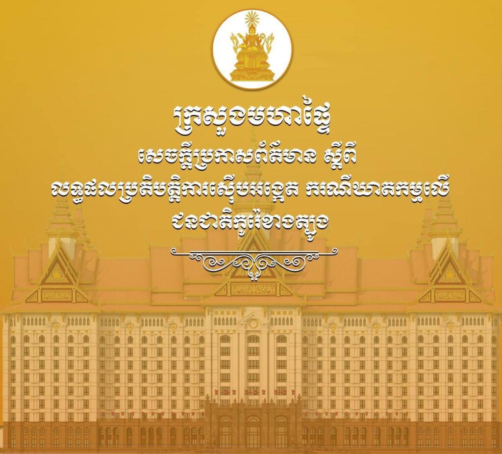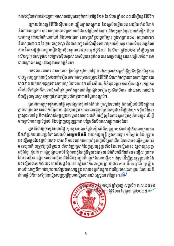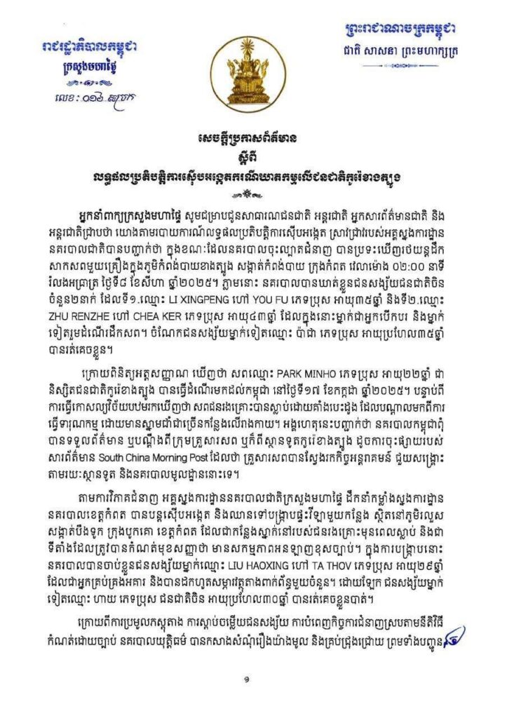 PTH: យោងតាមសេចក្តីប្រកាសព័ត៍មានរបស់ក្រសួងមហាផ្ទៃ ស្តីពីលទ្ធផលប្រតិបត្តិការស៊ើបអង្កេតករណ៍ឃាតកម្មលើជនជាតិកូរ៉េខាងត្បូងអ្នកនាំពាក្យក្រសួងមហាផ្ទៃ សូមជម្រាបជូនសាធារណជនជាតិ អន្តរជាតិ អ្នកសារព័ត៌មានជាតិ និង អន្តរជាតិជ្រាបថា យោងតាមរបាយការណ៍លទ្ធផលប្រតិបត្តិការស៊ើបអង្កេត ស្រាវជ្រាវរបស់អគ្គស្នងការដ្ឋាន នគរបាលជាតិបានបញ្ជាក់ថា ក្នុងខណៈដែលនគរបាលចុះល្បាតជំនាញ បានប្រទះឃើញរថយន្តដឹក សាកសពមួយគ្រឿងក្នុងភូមិកំពង់បាយខាងត្បូង សង្កាត់កំពង់បាយ ក្រុងកំពត វេលាម៉ោង ០២:០០ នាទី រំលងអធ្រាត្រ ថ្ងៃទី៨ ខែសីហា ឆ្នាំ២០២៥។ ភ្លាមនោះ នគរបាលបានឃាត់ខ្លួនជនសង្ស័យជនជាតិចិន ចំនួន២នាក់ ដែលទី១.ឈ្មោះ LI XINGPENG ហៅ YOU FU ភេទប្រុស អាយុ៣៥ឆ្នាំ និងទី២.ឈ្មោះ ZHU RENZHE ហៅ CHEA KER ភេទប្រុស អាយុ៤៣ឆ្នាំ ដែលក្នុងនោះម្នាក់ជាអ្នកបើកបរ និងម្នាក់ ទៀតរួមដំណើរដឹកសព។ ចំណែកជនសង្ស័យម្នាក់ទៀតឈ្មោះ ប៉ាជា ភេទប្រុស អាយុប្រហែល៣៥ឆ្នាំ បានរត់គេចខ្លួន។ក្រោយពិនិត្យអត្តសញ្ញាណ ឃើញថា សពឈ្មោះ PARK MINHO ភេទប្រុស អាយុ២២ឆ្នាំ ជា និស្សិតជនជាតិកូរ៉េខាងត្បូង បានធ្វើដំណើរមកដល់កម្ពុជា នៅថ្ងៃទី១៧ ខែកក្កដា ឆ្នាំ២០២៥។ បន្ទាប់ពី ការធ្វើកោសល្យវិច័យបឋមរកឃើញថា សពជនរងគ្រោះបានស្លាប់ដោយគាំងបេះដូង ដែលបណ្ដាលមកពីការ ធ្វើទារុណកម្ម ដោយមានស្នាមជាំជាច្រើនកន្លែងលើរាងកាយ។ អង្គហេតុនេះបញ្ជាក់ថា នគរបាលកម្ពុជាពុំ បានទទួលព័ត៌មាន ឬបណ្តឹងពីក្រុមគ្រួសារសព ឬក៏ពីស្ថានទូតកូរ៉េខាងត្បូង ដូចការចុះផ្សាយរបស់ សារព័ត៌មាន South China Morning Post ដែលថា គ្រួសារសពបានស្វែងរកកិច្ចអន្តរាគមន៍ ជួយសង្គ្រោះ តាមរយៈស្ថានទូត និងនគរបាលមូលដ្ឋាននោះទេ។តាមការវិភាគជំនាញ អគ្គស្នងការដ្ឋាននគរបាលជាតិក្រសួងមហាផ្ទៃ ដឹកនាំកម្លាំងស្នងការដ្ឋាន នគរបាលខេត្តកំពត បានបន្តស៊ើបអង្កេត និងឈានទៅបង្ក្រាបផ្ទះវីឡាមួយកន្លែង ស្ថិតនៅភូមិរលួស សង្កាត់បឹងទូក ក្រុងបូកគោ ខេត្តកំពត ដែលជាកន្លែងស្នាក់នៅរបស់ជនរងគ្រោះមុនពេលស្លាប់ និងជា ទីតាំងដែលត្រូវបានកំណត់មុខសញ្ញាថា មានសកម្មភាពអនឡាញខុសច្បាប់។ ក្នុងការបង្ក្រាបនោះ នគរបាលបានចាប់ខ្លួនជនសង្ស័យម្នាក់ឈ្មោះ LIU HAOXING ហៅ TA THOV ភេទប្រុស អាយុ២៩ឆ្នាំ ដែលជាអ្នកគ្រប់គ្រងអគារ និងបានដកហូតសម្ភារវត្ថុតាងពាក់ព័ន្ធមួយចំនួន។ ដោយឡែក ជនសង្ស័យម្នាក់ ទៀតឈ្មោះ ហាយ ភេទប្រុស ជនជាតិចិន អាយុប្រហែល៣០ឆ្នាំ បានរត់គេចខ្លួនបាត់។ក្រោយពីការប្រមូលភស្តុតាង ការស្តាប់ចម្លើយជនសង្ស័យ ការបំពេញកិច្ចការជំនាញស្របតាមនីតិវិធី កំណត់ដោយច្បាប់ នគរបាលយុត្តិធម៌ បានកសាងសំណុំរឿងយ៉ាងមូល និងគ្រប់ជ្រុងជ្រោយ ព្រមទាំងបញ្ចូនជនសង្ស័យទៅកាន់អយ្យការអមសាលាដំបូងខេត្តកំពត នៅថ្ងៃទី១១