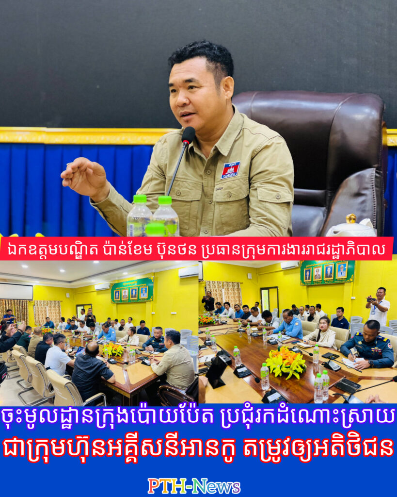 ឯកឧត្តមបណ្ឌិត ប៉ាន់ខែម ប៊ុនថន ប្រធានក្រុមការងាររាជរដ្ឋាភិបាលចុះមូលដ្ឋានក្រុងប៉ោយប៉ែត ប្រជុំរកដំណោះស្រាយជាក្រុមហ៊ុនអគ្គីសនីអានកូ តម្រូវឲ្យអតិថិជន